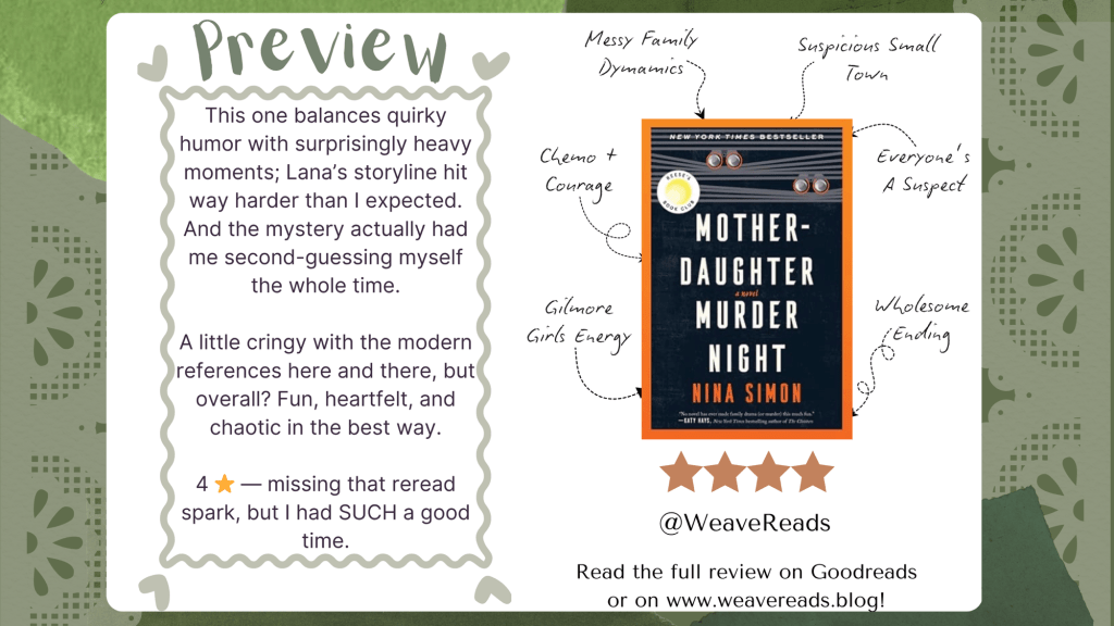 I went into “Mother-Daughter Murder Club” expecting something light and cozy, but this actually surprised me in the best way. The opening fake-out with the “body” turning out to be a seal?? Weirdly hilarious. It immediately set the tone: this book knows it’s a little quirky and leans into it.