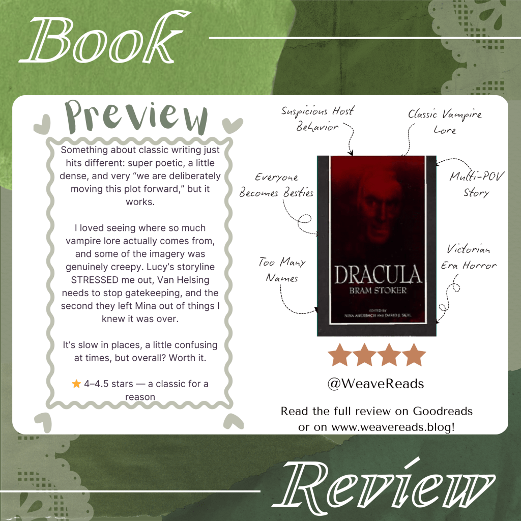 There’s something about classic novels that just feels different. Dracula has that dense, almost poetic narration where dialogue comes in these big, blocky paragraphs and everything feels intentional, like the characters themselves are aware they’re moving the story forward. It’s not my favorite style to read all the time, but I really appreciated it here. It gives the story a weight that modern writing doesn’t always have.